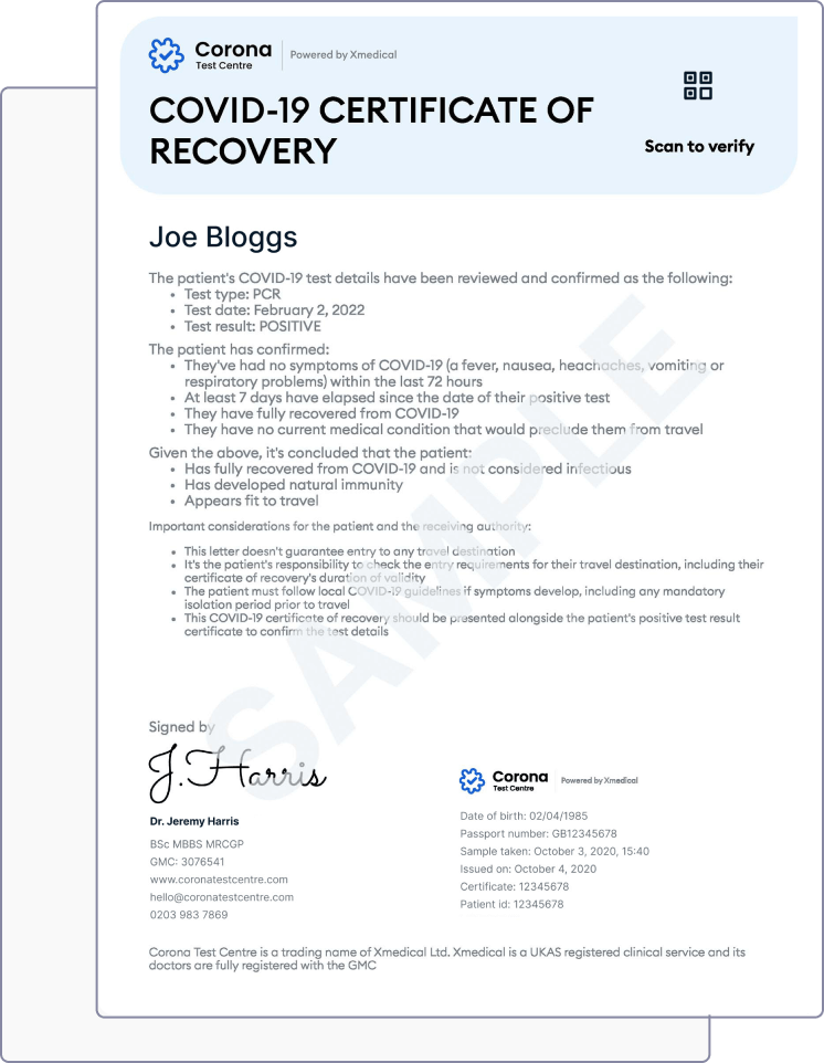 A Covid-19 Recovery Certificate, also known as Proof of Covid Recovery, a Covid Recovery Letter or Proof of Natural Immunity, confirms that you have recently had Covid-19 and have recovered so are likely to be protected against Coronavirus by your antibodies.